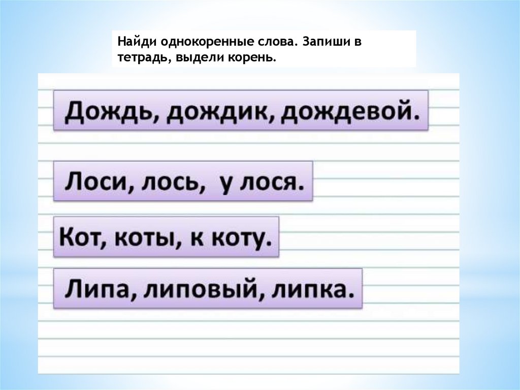 Найди однокоренные слова. Запиши в
