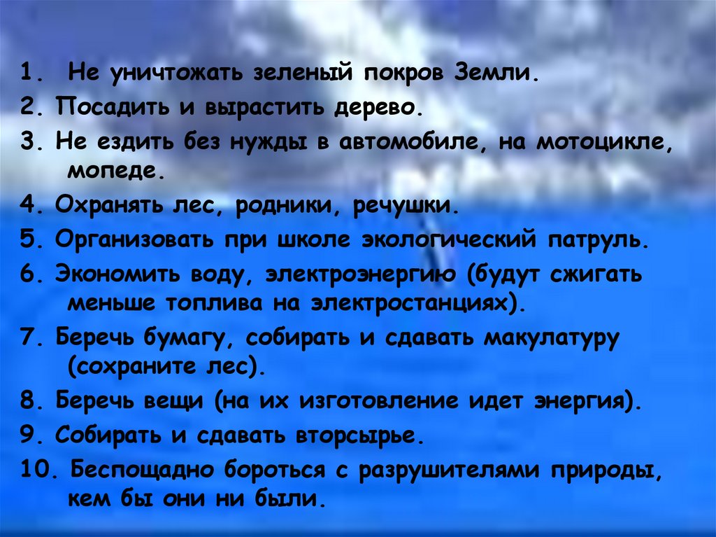 1. Не уничтожать зеленый покров Земли.2. Посадить и вырастить дерево.