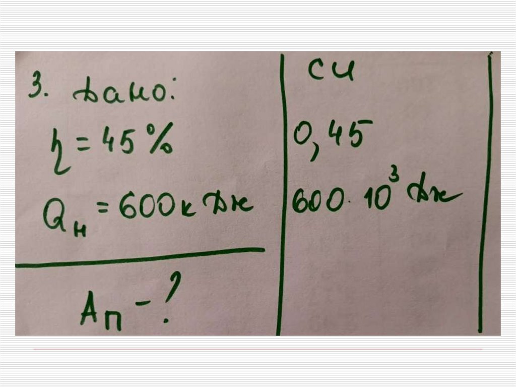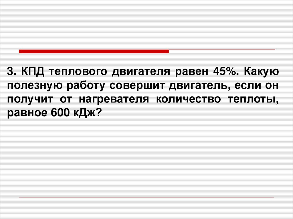 3. КПД теплового двигателя равен 45%. Какуюполезную работу совершит двигатель, если он
