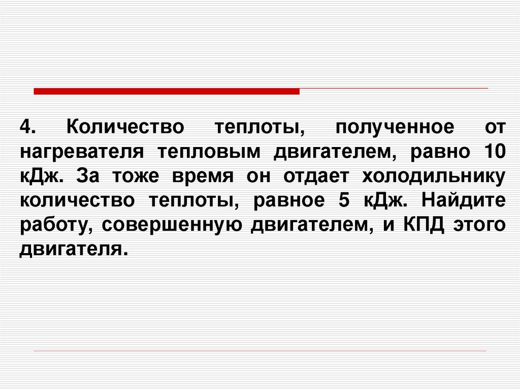 4. Количество теплоты, полученное отнагревателя тепловым двигателем, равно 10