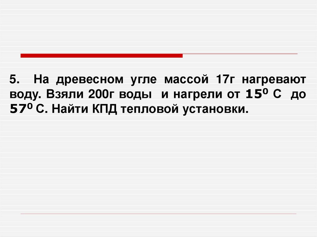 5. На древесном угле массой 17г нагреваютводу. Взяли 200г воды и нагрели от 150 С до