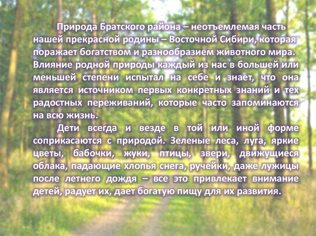Природа Братского района – неотъемлемая частьнашей прекрасной родины – Восточной Сибири, которая