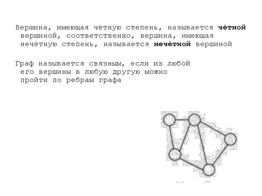 Вершина, имеющая чётную степень, называется чётнойвершиной, соответственно, вершина, имеющая