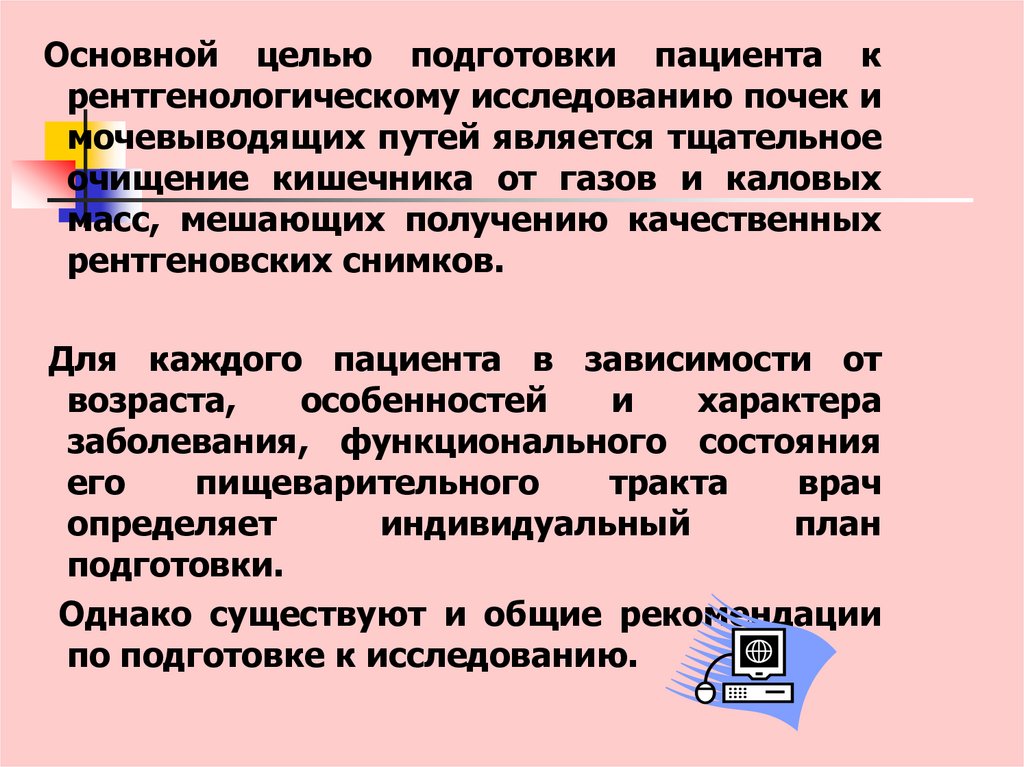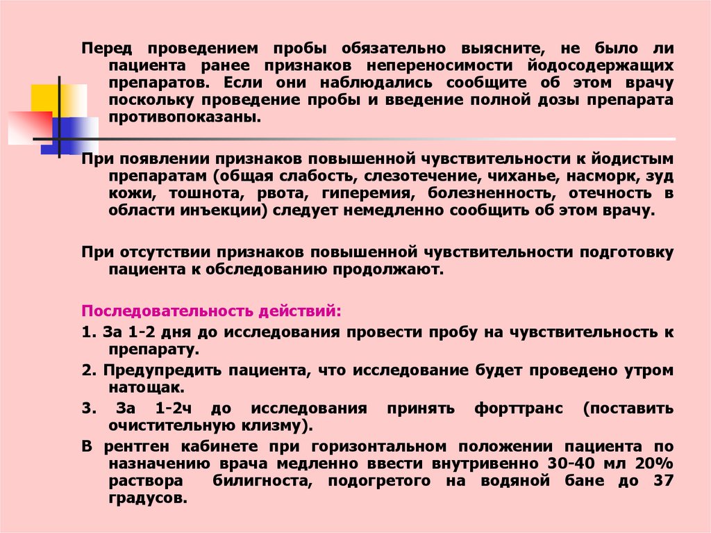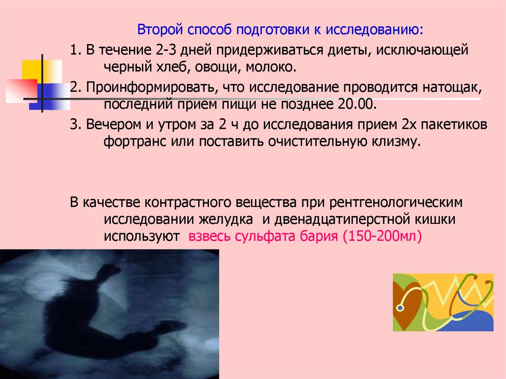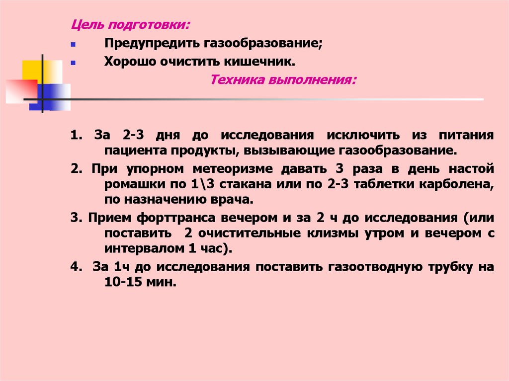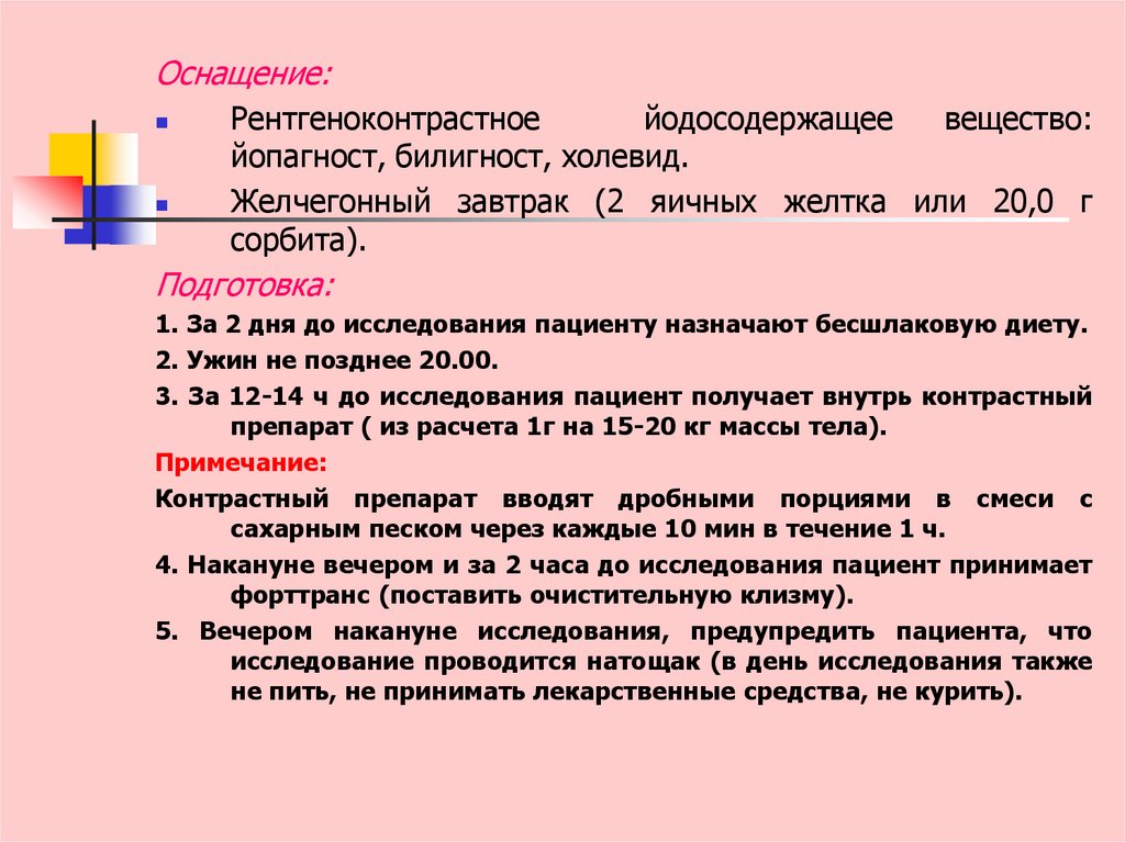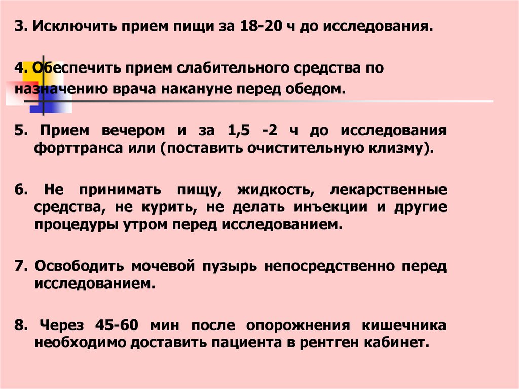 3. Исключить прием пищи за 18-20 ч до исследования.4. Обеспечить прием слабительного средства по