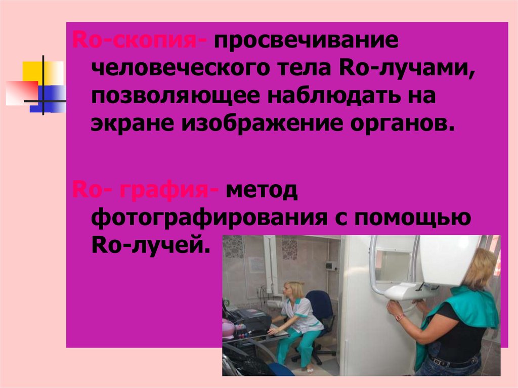 Ro-скопия- просвечиваниечеловеческого тела Ro-лучами,
