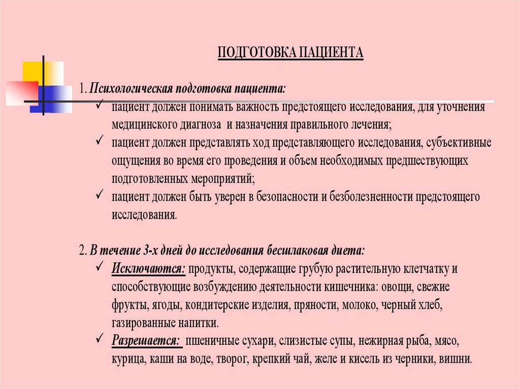 ПОДГОТОВКА ПАЦИЕНТА1. Психологическая подготовка пациента: