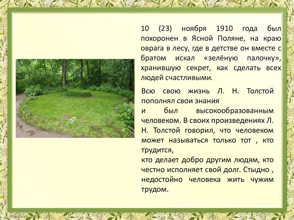 10 (23) ноября 1910 года былпохоронен в Ясной Поляне, на краю