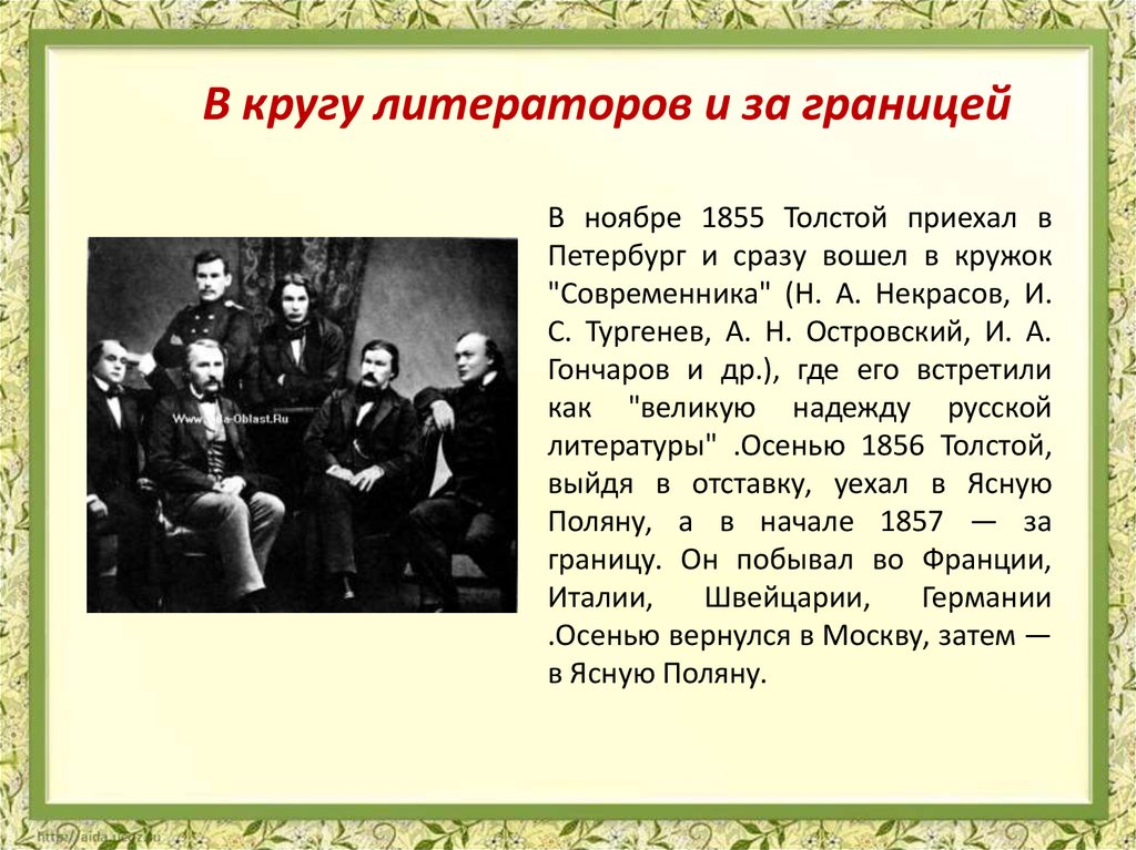 В кругу литераторов и за границейВ ноябре 1855 Толстой приехал в