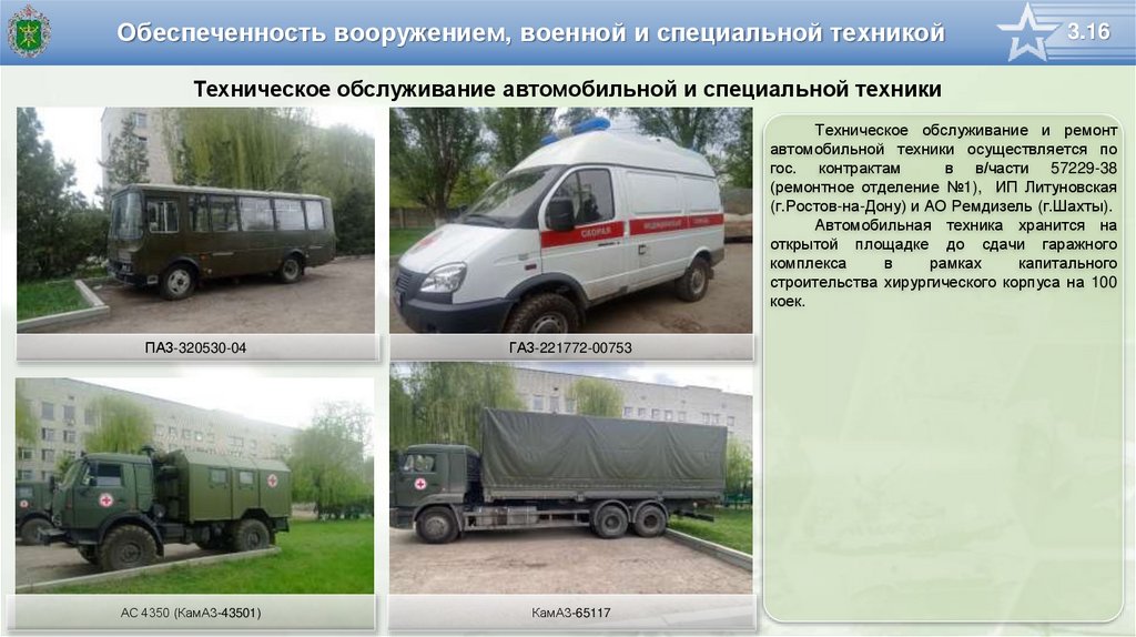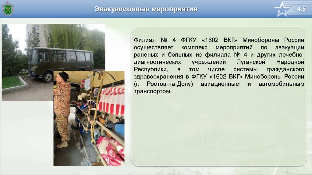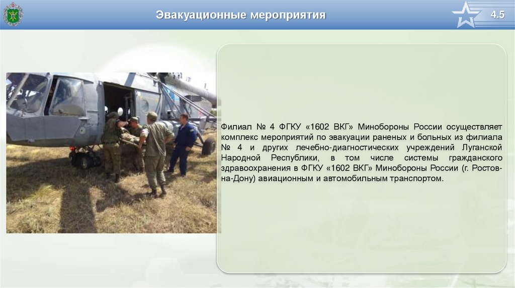 здравоохранения в ФГКУ «1602 ВКГ» Минобороны России (г. Ростовна-Дону) авиационным и автомобильным транспортом.