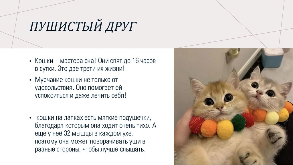 ПУШИСТЫЙ ДРУГ• Кошки – мастера сна! Они спят до 16 часов