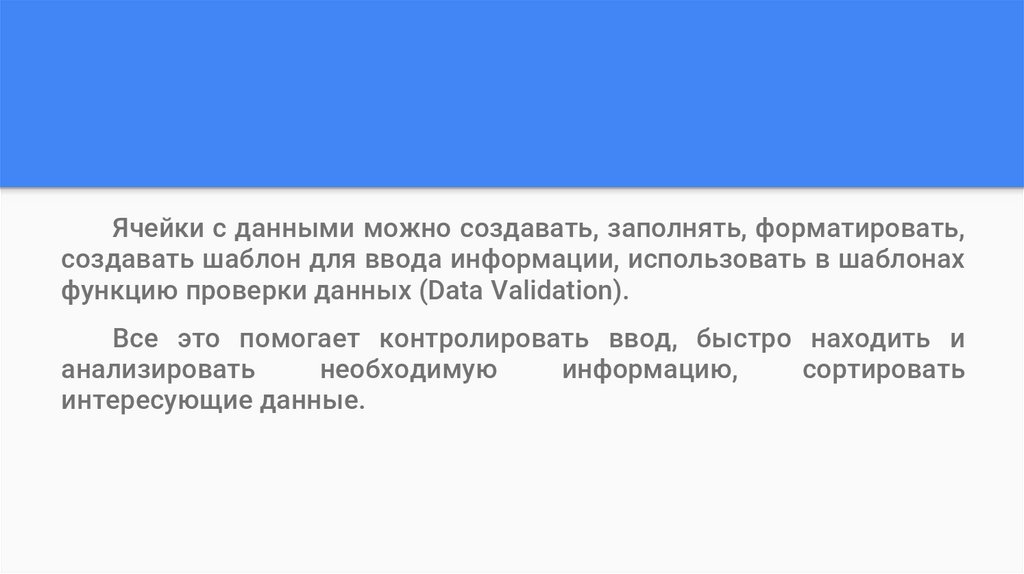 Ячейки с данными можно создавать, заполнять, форматировать,создавать шаблон для ввода информации, использовать в шаблонах