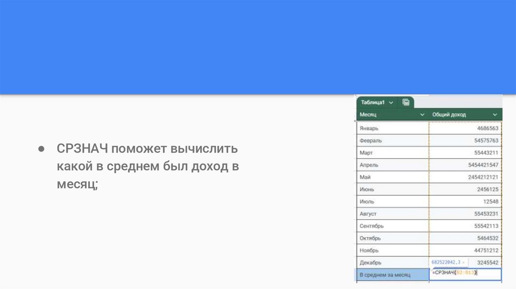 ● СРЗНАЧ поможет вычислитькакой в среднем был доход в