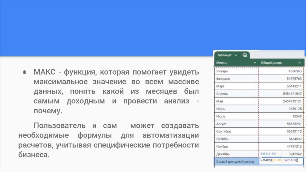 ● МАКС - функция, которая помогает увидетьмаксимальное значение во всем массиве