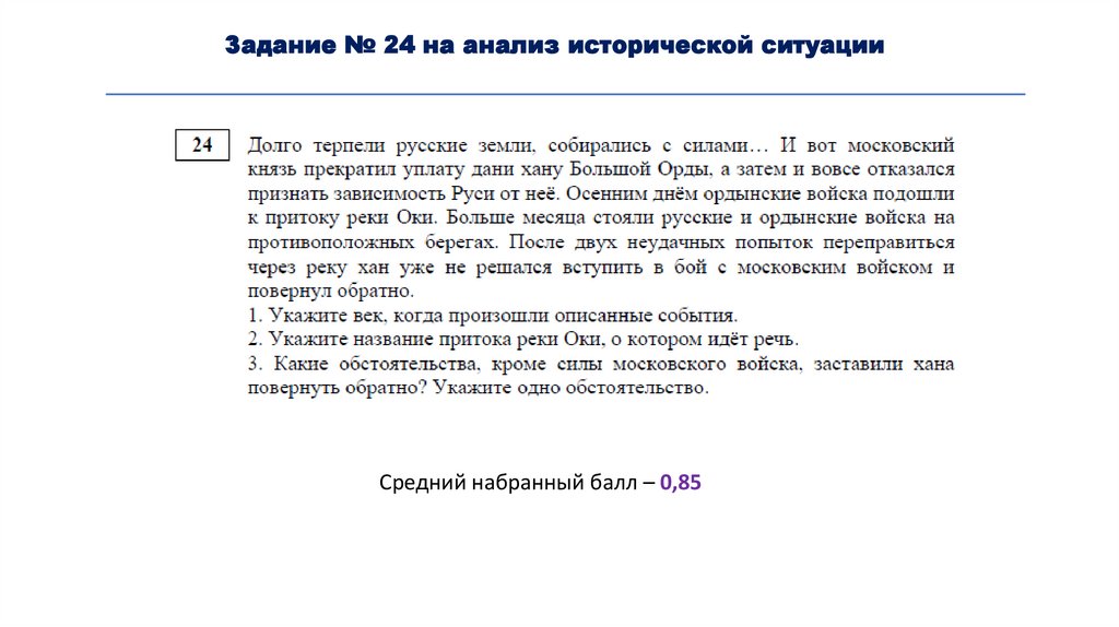 Задание № 24 на анализ исторической ситуацииСредний набранный балл – 0,85