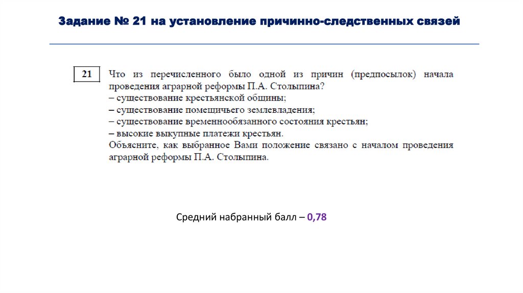 Задание № 21 на установление причинно-следственных связейСредний набранный балл – 0,78