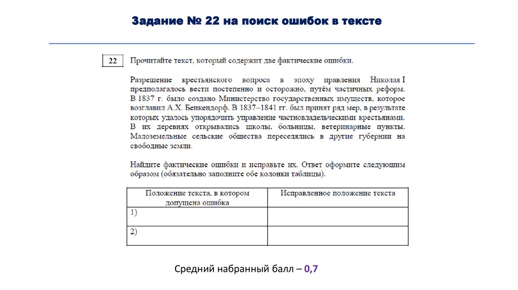 Задание № 22 на поиск ошибок в текстеСредний набранный балл – 0,7