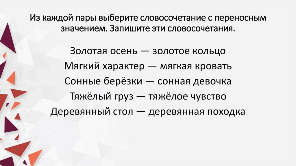 1. Из каждой пары выберите словосочетание с переносным значением. Запишите эти словосочетания.