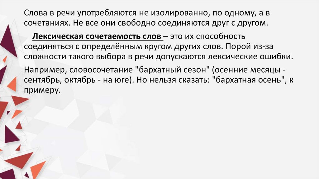 Слова в речи употребляются не изолированно, по одному, а всочетаниях. Не все они свободно соединяются друг с другом.