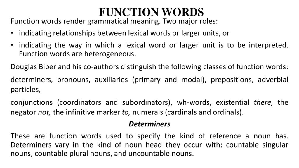 Function words render grammatical meaning. Two major roles:• indicating relationships between lexical words or larger units, or