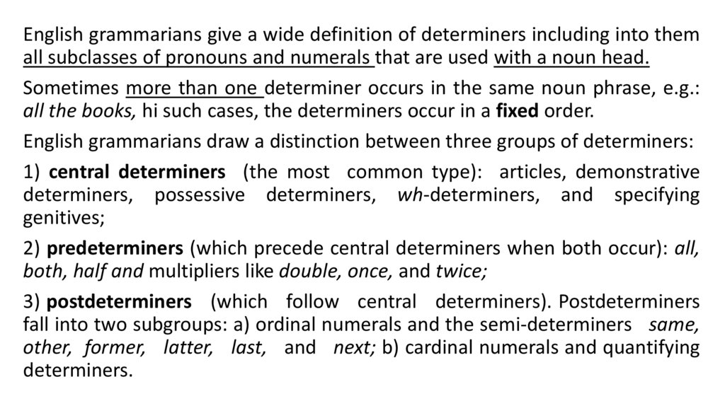 English grammarians give a wide definition of determiners including into themall subclasses of pronouns and numerals that are used with a noun head.