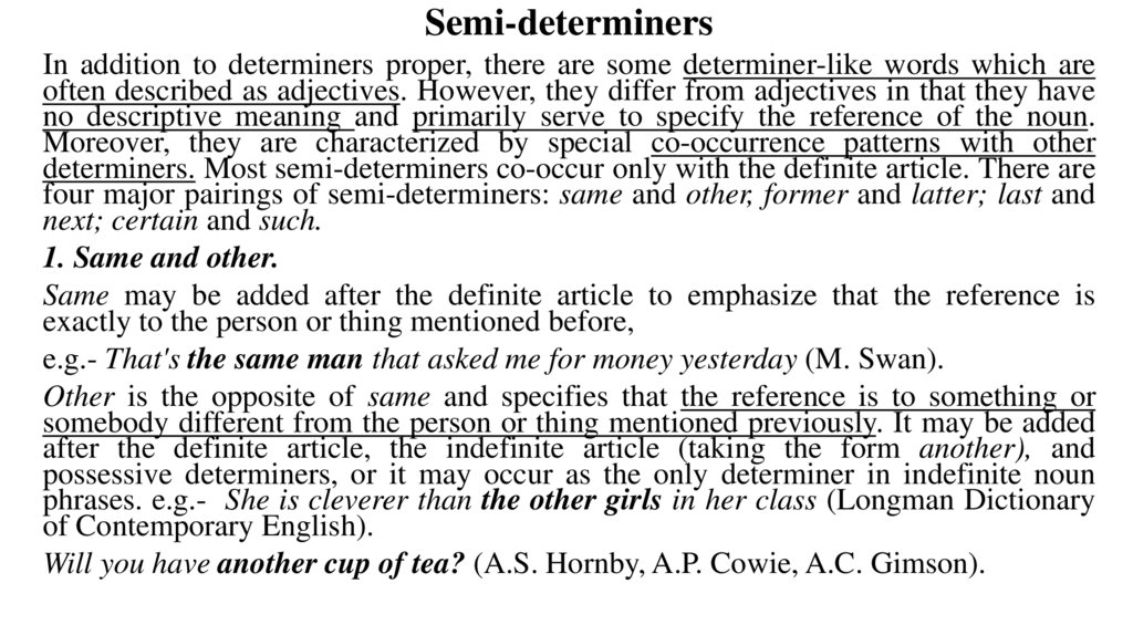 fall into two subgroups: a) ordinal numerals and the semi-determiners same,