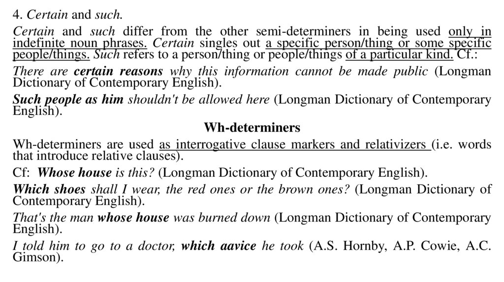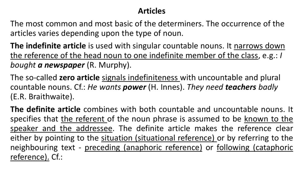 ArticlesThe most common and most basic of the determiners. The occurrence of the