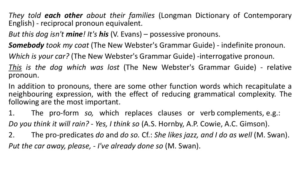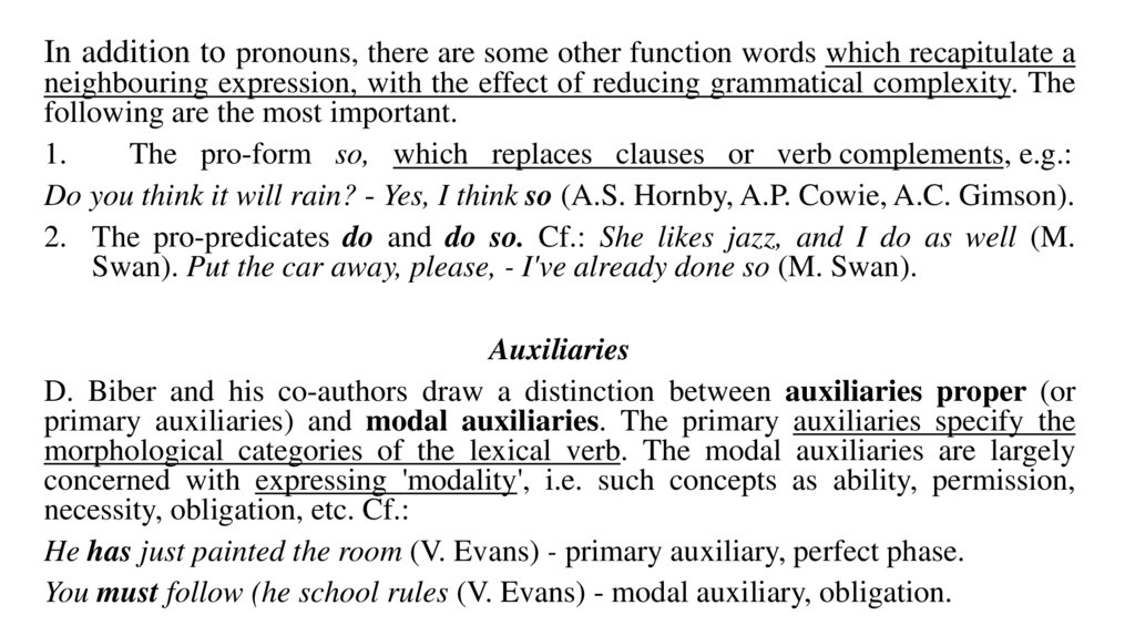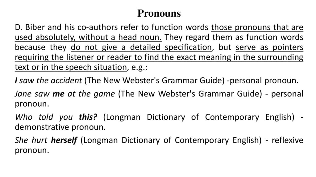 Douglas Biber and his co-authors distinguish the following classes of function words: