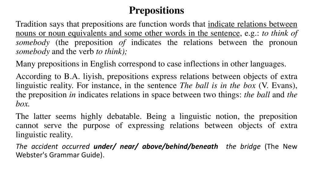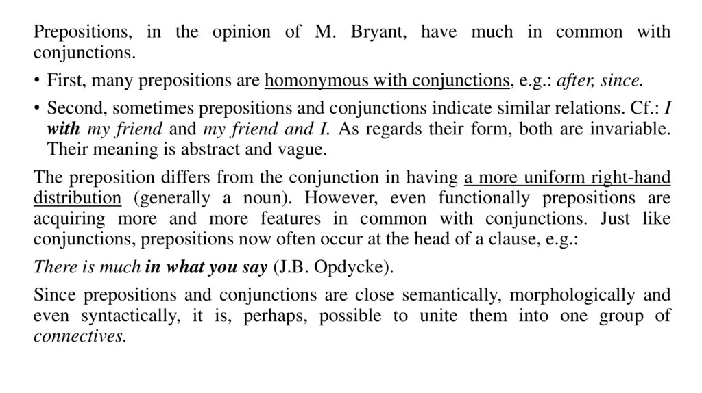 Prepositions, in the opinion of M. Bryant, have much in common withconjunctions.
