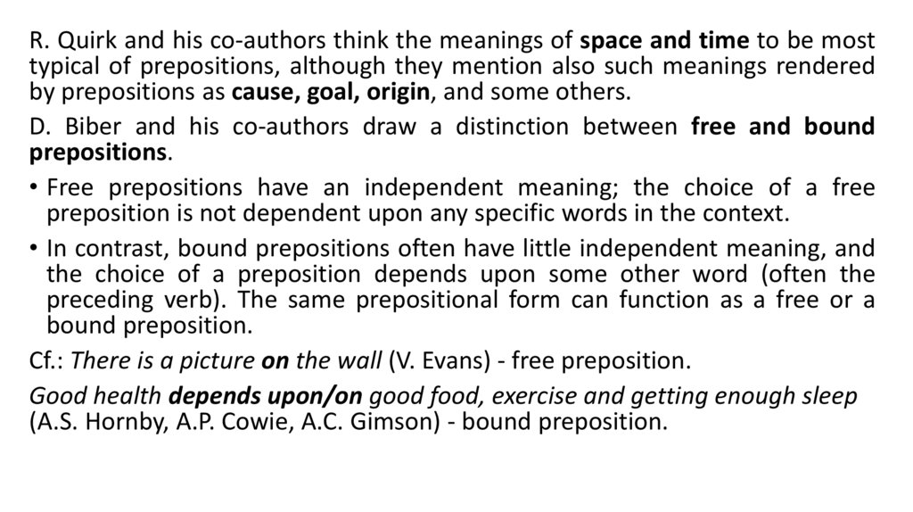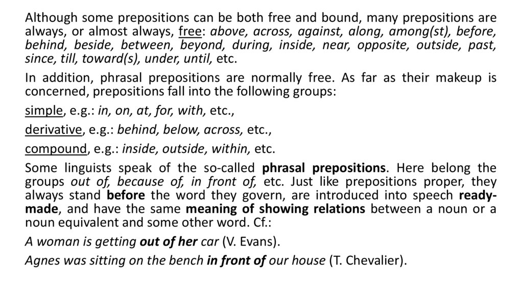 Although some prepositions can be both free and bound, many prepositions arealways, or almost always, free: above, across, against, along, among(st), before,