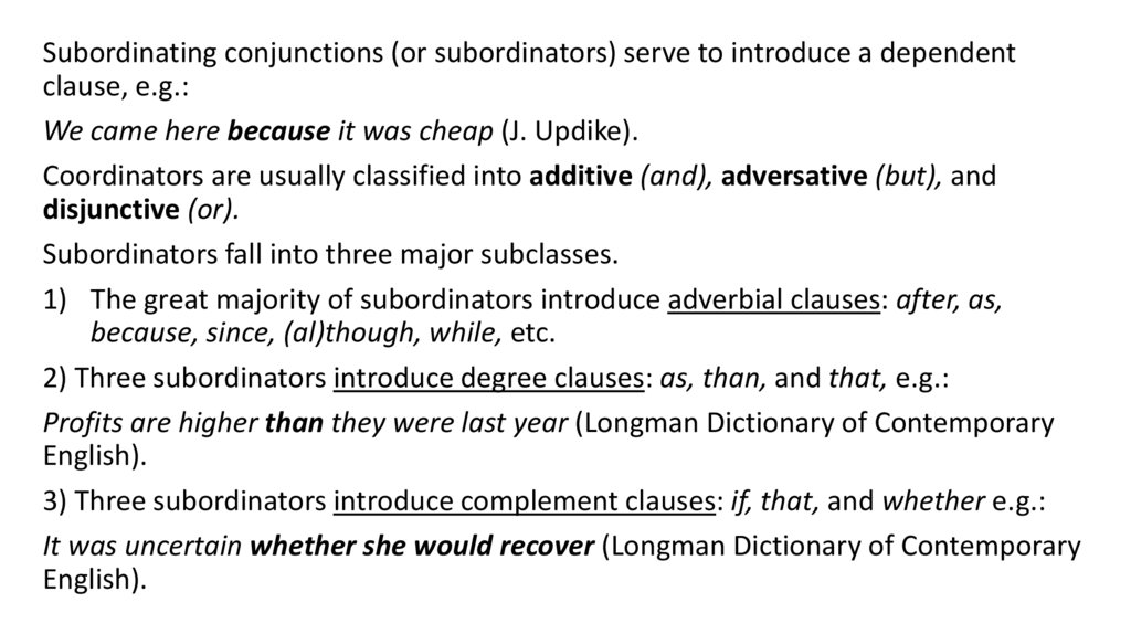 Subordinating conjunctions (or subordinators) serve to introduce a dependentclause, e.g.: