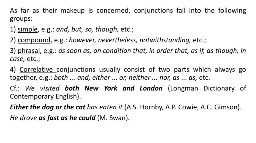 As far as their makeup is concerned, conjunctions fall into the followinggroups: