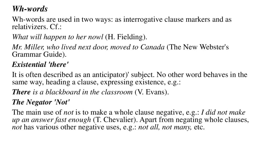 conjunctions (coordinators and subordinators), wh-words, existential there, the