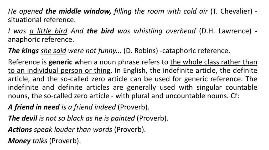 He opened the middle window, filling the room with cold air (T. Chevalier) situational reference.I was a little bird And the bird was whistling overhead (D.H. Lawrence) anaphoric reference.