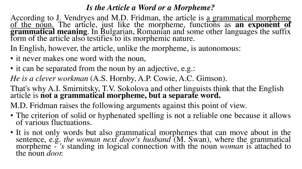 Is the Article a Word or a Morpheme?According to J. Vendryes and M.D. Fridman, the article is a grammatical morpheme