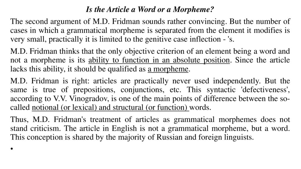 Thus, M.D. Fridman's treatment of articles as grammatical morphemes does not