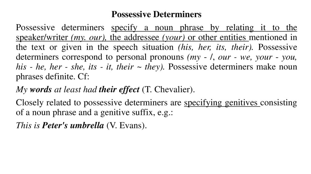 Possessive DeterminersPossessive determiners specify a noun phrase by relating it to the