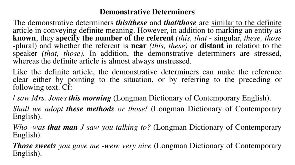 Demonstrative DeterminersThe demonstrative determiners this/these and that/those are similar to the definite
