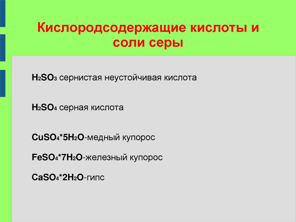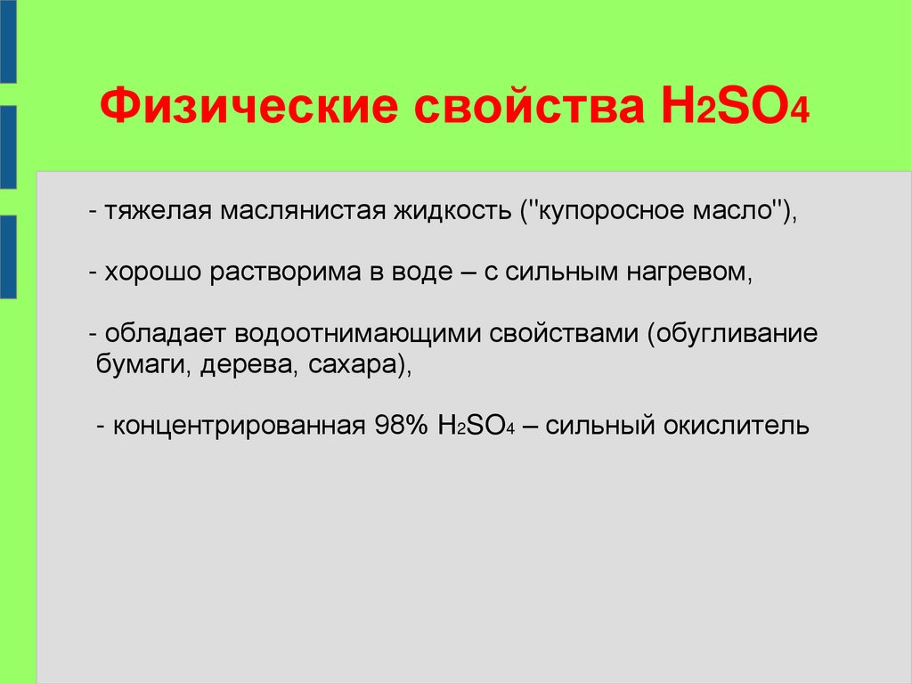 Физические свойства H2SO4- тяжелая маслянистая жидкость ("купоросное масло"),