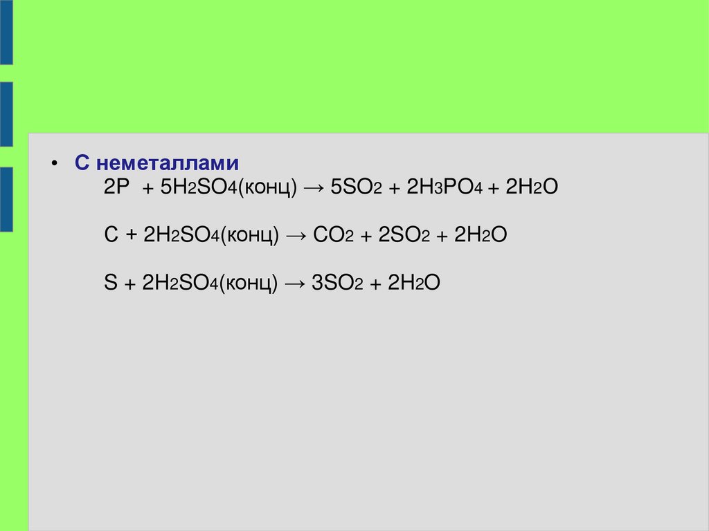 • С неметаллами2P + 5H2SO4(конц) → 5SO2 + 2H3PO4 + 2Н2О