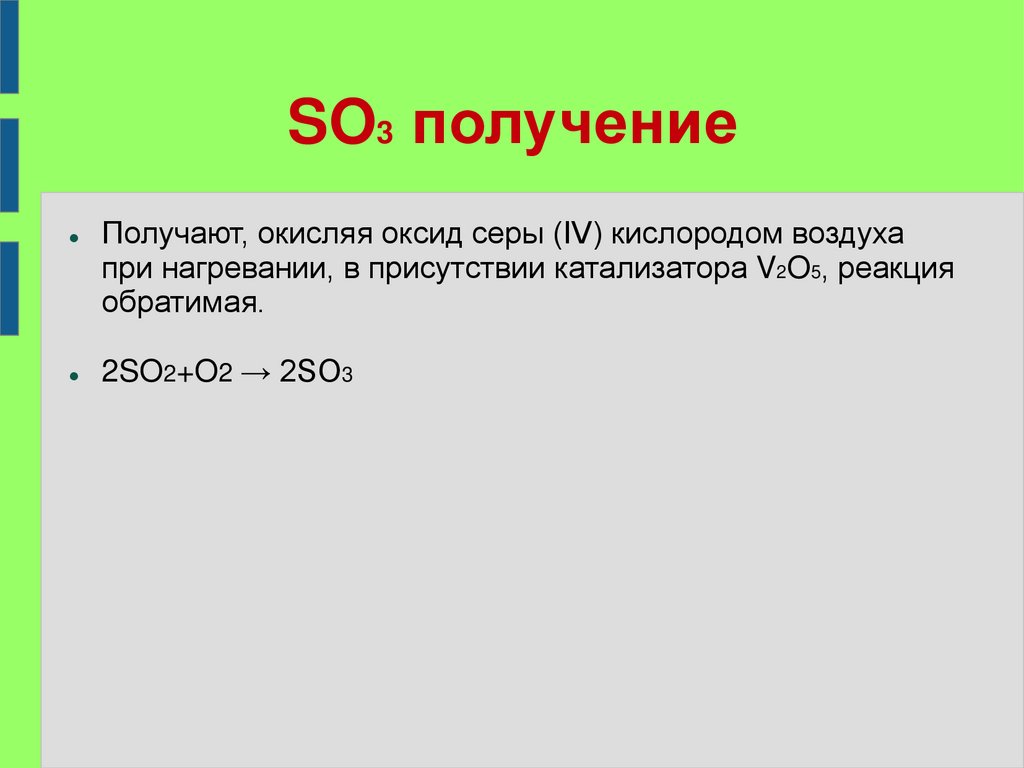 SO3 получениеПолучают, окисляя оксид серы (IV) кислородом воздуха
