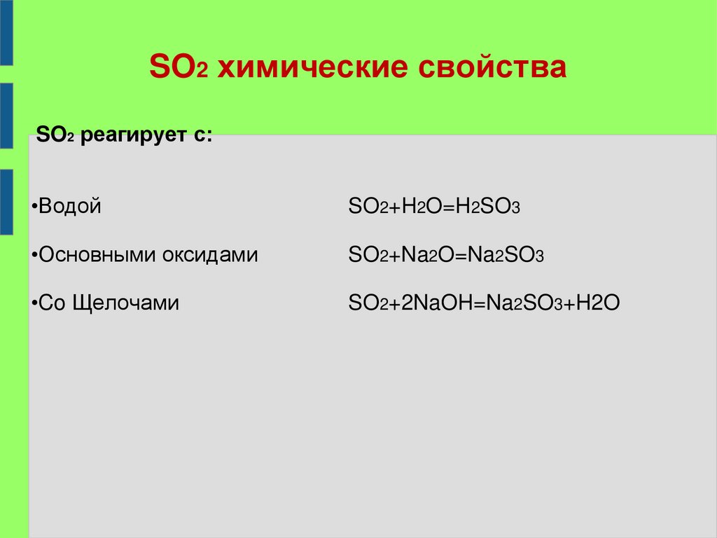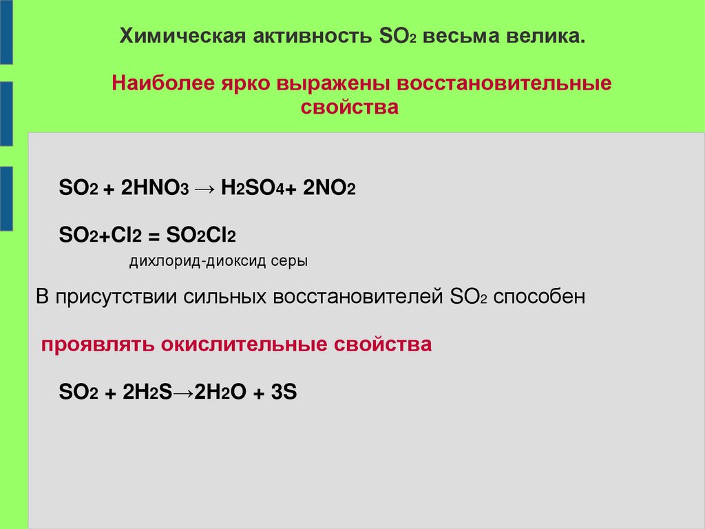 Химическая активность SO2 весьма велика.Наиболее ярко выражены восстановительные