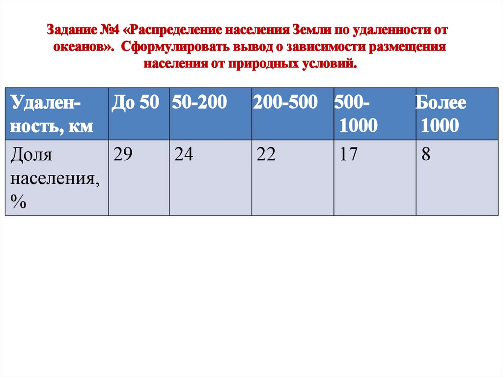 Задание №4 «Распределение населения Земли по удаленности отокеанов». Сформулировать вывод о зависимости размещения