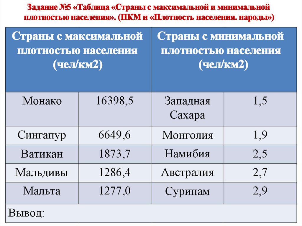 Задание №5 «Таблица «Страны с максимальной и минимальнойплотностью населения». (ПКМ и «Плотность населения. народы»)