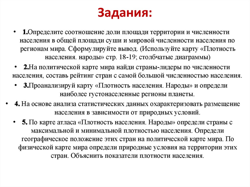 Задания:• 1.Определите соотношение доли площади территории и численности