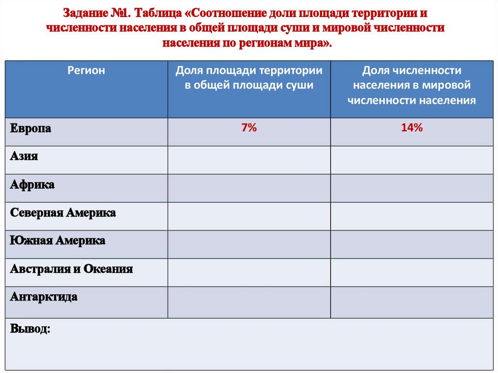 Задание №1. Таблица «Соотношение доли площади территории ичисленности населения в общей площади суши и мировой численности