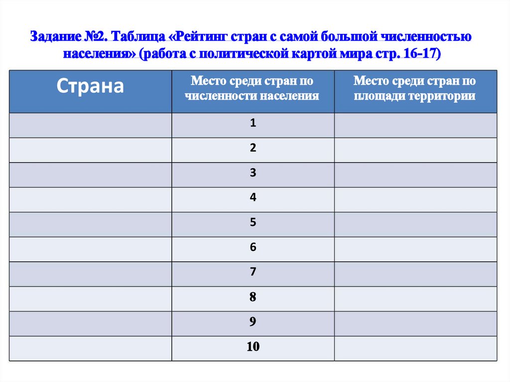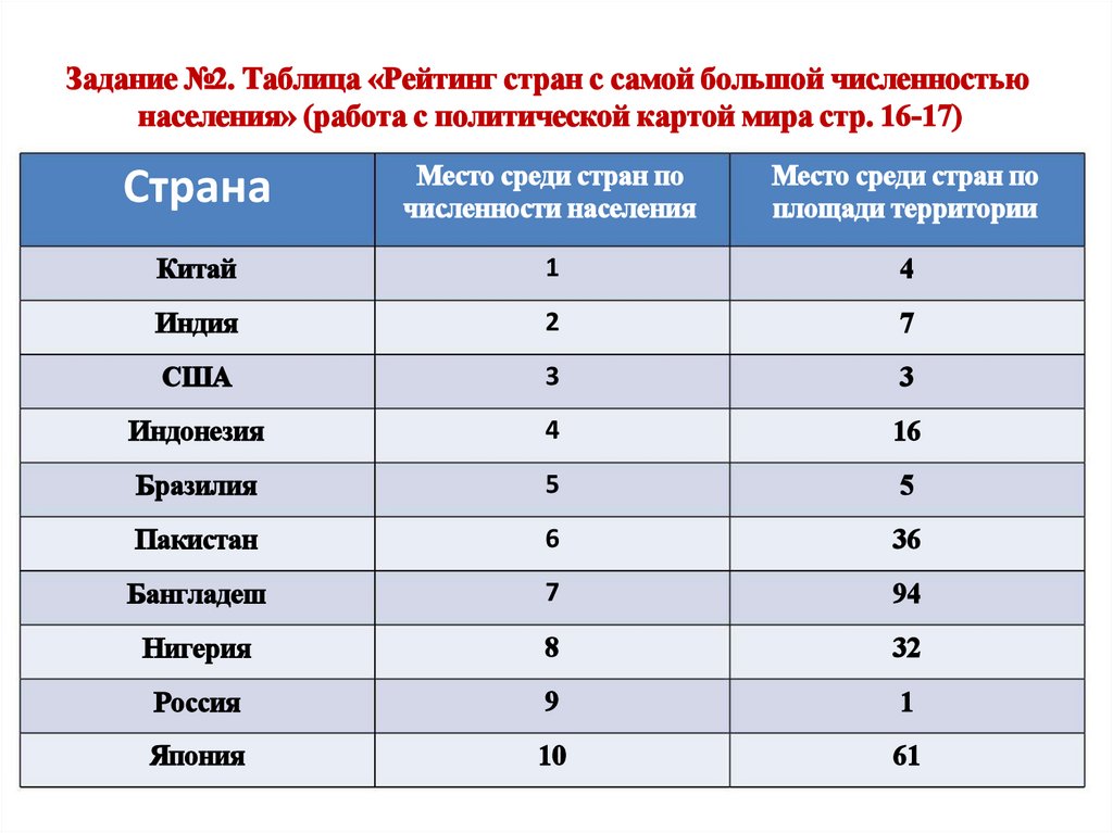 Задание №2. Таблица «Рейтинг стран с самой большой численностьюнаселения» (работа с политической картой мира стр. 16-17)