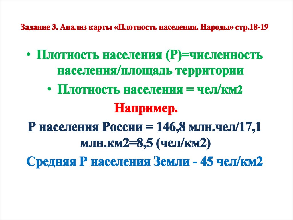 Задание 3. Анализ карты «Плотность населения. Народы» стр.18-19• Плотность населения (Р)=численность