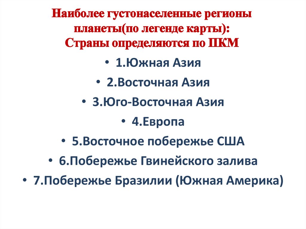 Наиболее густонаселенные регионыпланеты(по легенде карты):