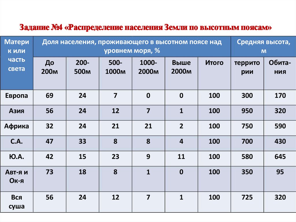 Задание №4 «Распределение населения Земли по высотным поясам»Матери