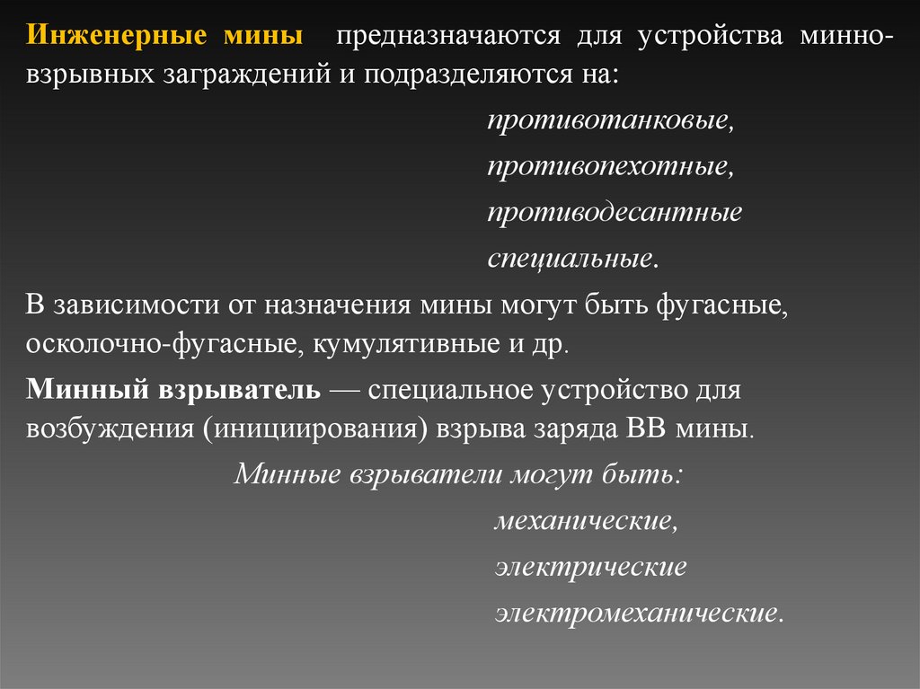 Инженерные мины предназначаются для устройства минновзрывных заграждений и подразделяются на:противотанковые,